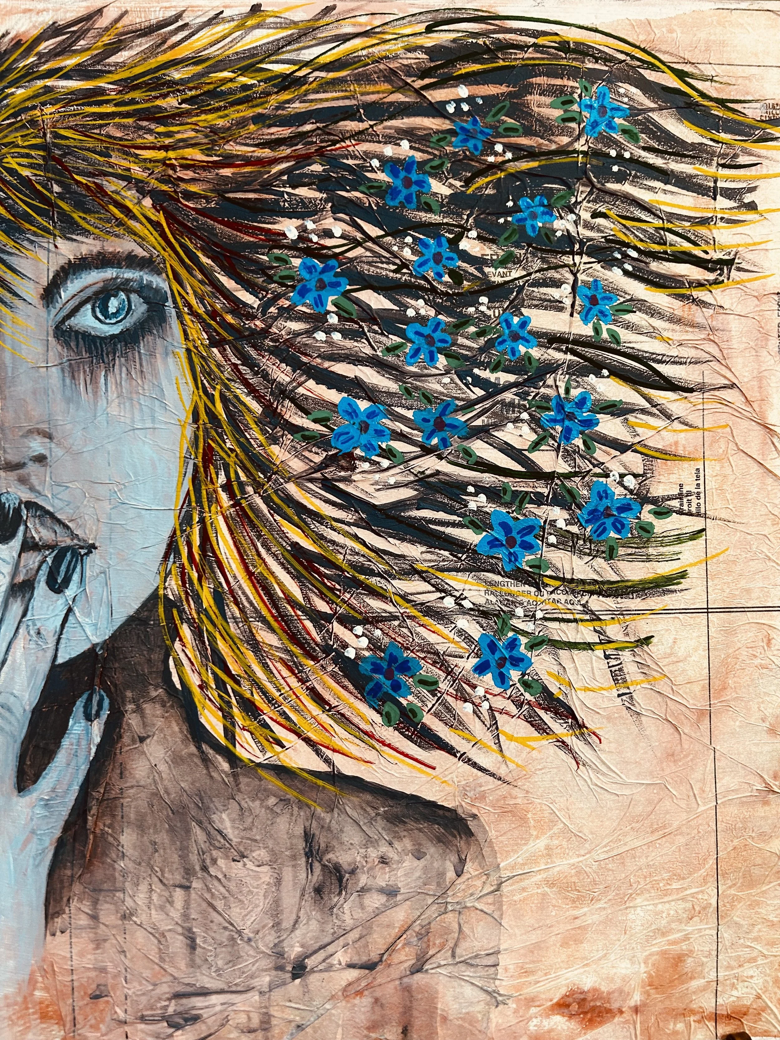Within the strands bloom vivid blue flowers, a symbol of resilience and transformation, offering contrast against the earthy background. The layered textures and abstract mark-making give the piece movement and depth, which allows the viewer to discover new elements with each glance.