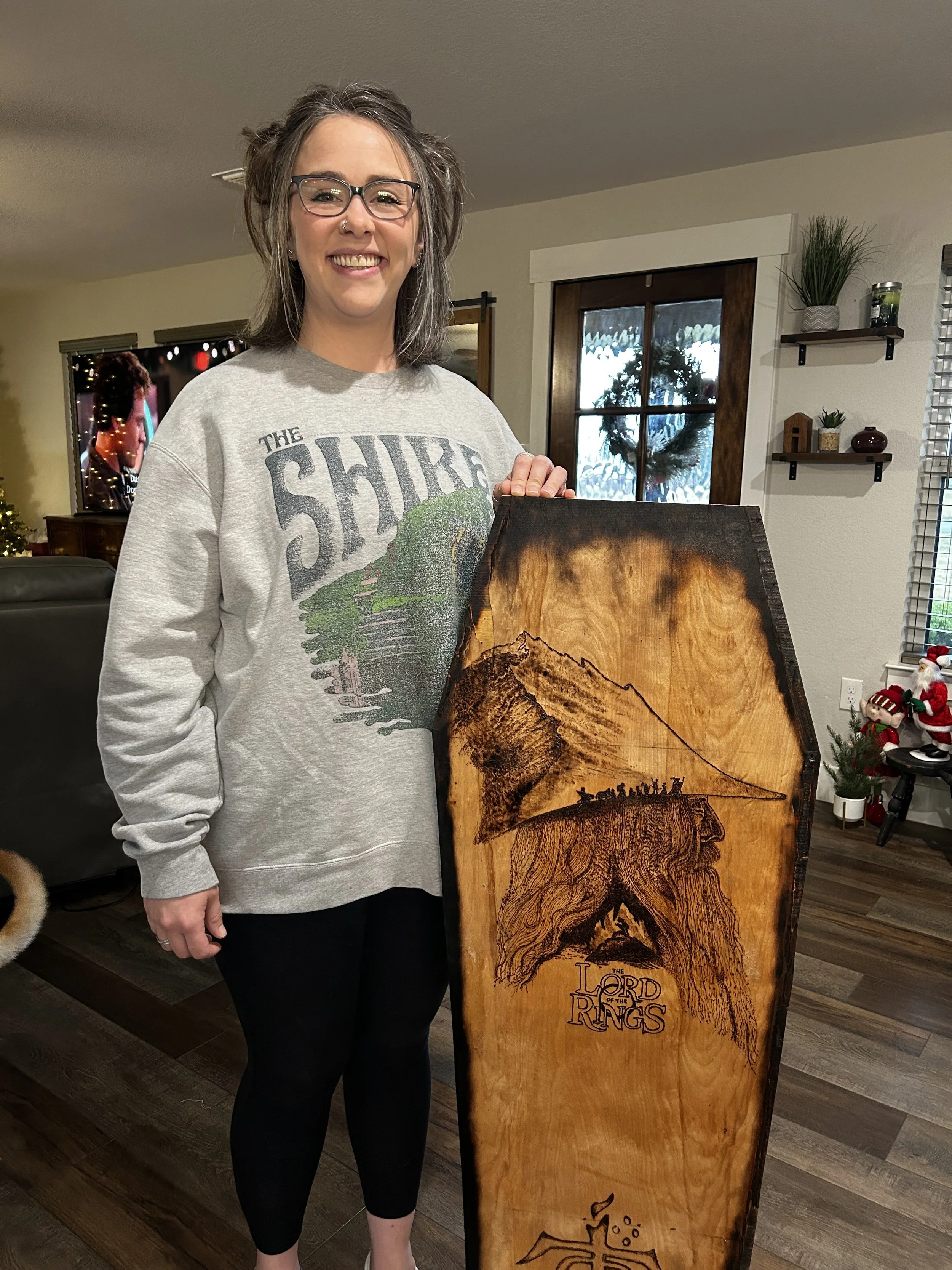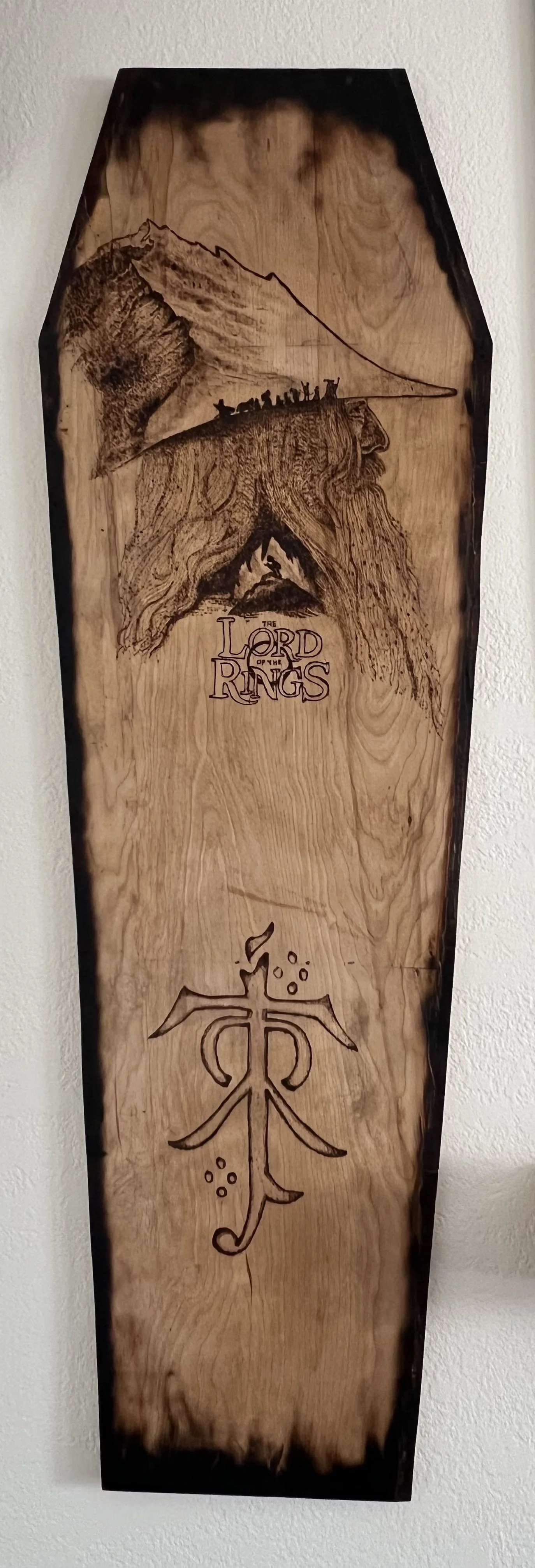 For collectors and fans of fantasy, this piece demonstrates how traditional techniques like wood-burning can merge with modern fandom to create unique, one-of-a-kind treasures. It stands as a testament to the universality of Tolkien’s work, reimagined through the hands of an artist who values both skill and storytelling.