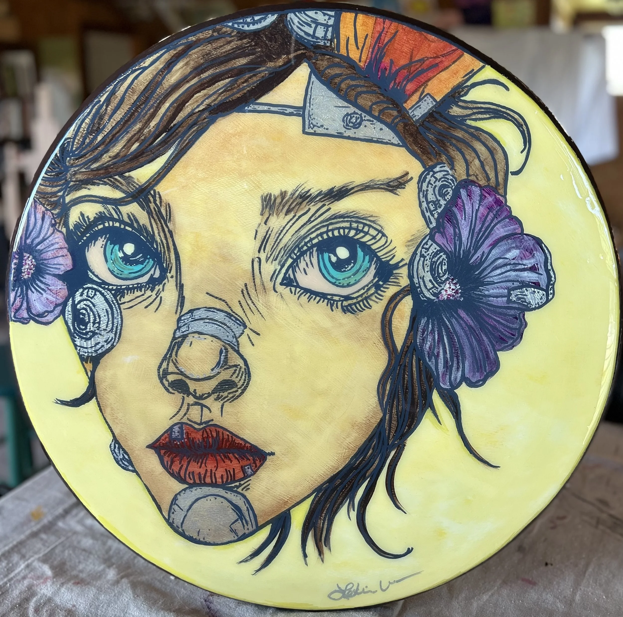 This poolside table features my original design, “Metal Girl,” a surreal and striking female portrait created with bold linework, vivid colors, and intricate mechanical details. Painted on a round tabletop surface, her piercing blue eyes, vibrant red lips, and floral-meets-industrial accents give her a commanding presence. The layered metallic and floral motifs suggest both strength and fragility, blending human emotion with machine-like precision.