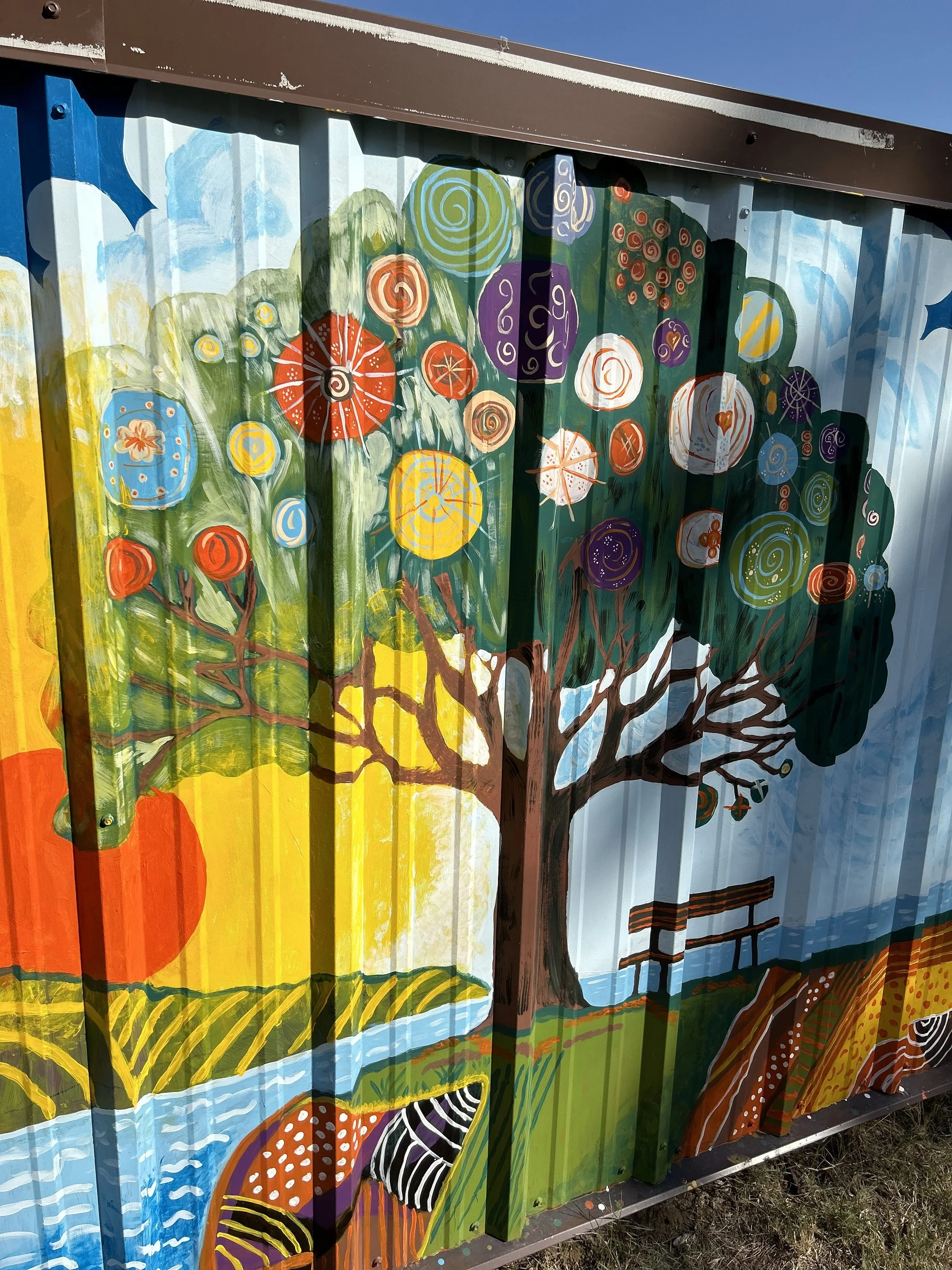 The mural depicts moving from darkness, barrenness, and despair and taking the steps necessary to emerge into this new, beautiful world. A world where we can join with our fellows in harmony. A life full of light, beauty, confidence, and color. For so many, this never becomes a reality… but for those who take the leap… happiness beyond measure.