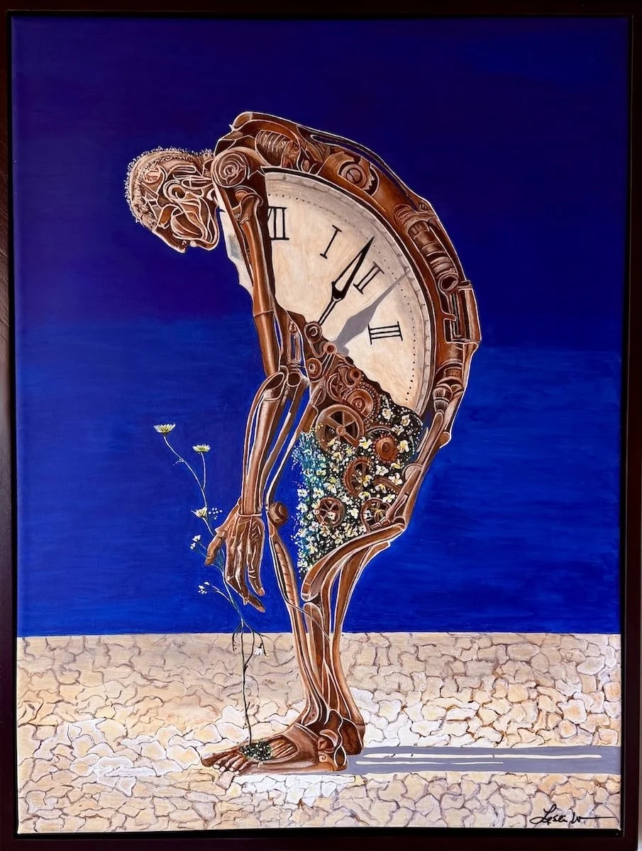 The Garden We Carry came from a very personal place. This painting is about transition and how painful it can be to move from one season of life to another. The curved posture of the figure reflects that weight, but the flowers growing from within the body represent ideas, inspiration, and the possibility of a new life taking shape.