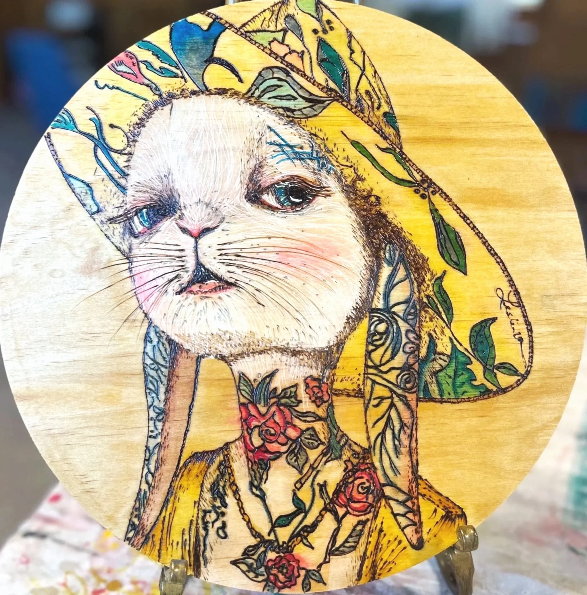 White Rabbit #5 continues the evolution of my White Rabbit pyrography series, blending classic storytelling inspiration with a modern, rebellious edge. Hand-burned into wood and enhanced with subtle color, this version of the rabbit wears a wide-brimmed patterned hat and sports bold floral tattoos across its neck and chest. Its expression — confident and slightly defiant — makes this rabbit one of the most personality-driven in the series.